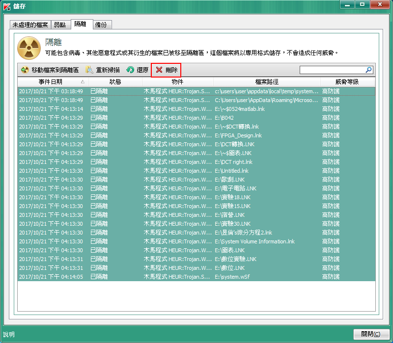 滑鼠指向第一個選項「檔案防護」,並按右鍵選擇「隔離」。