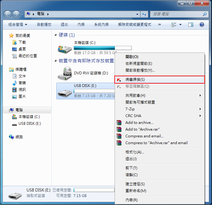 點選要掃毒的磁碟或是隨身碟(本手冊案例為隨身碟)開啟前,將滑鼠指向該區,並先按滑鼠右鍵,點選「病毒掃描」。