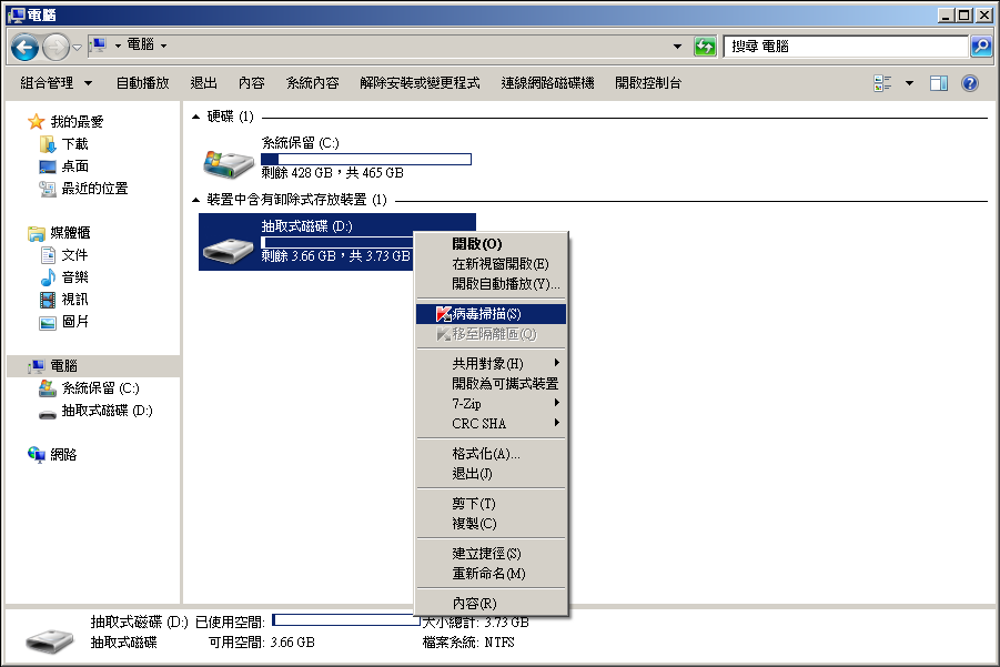 將滑鼠指到隨身碟並按右鍵,選擇病毒掃描。