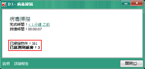 掃描結束後,防毒軟體會顯示偵測到的威脅數量。