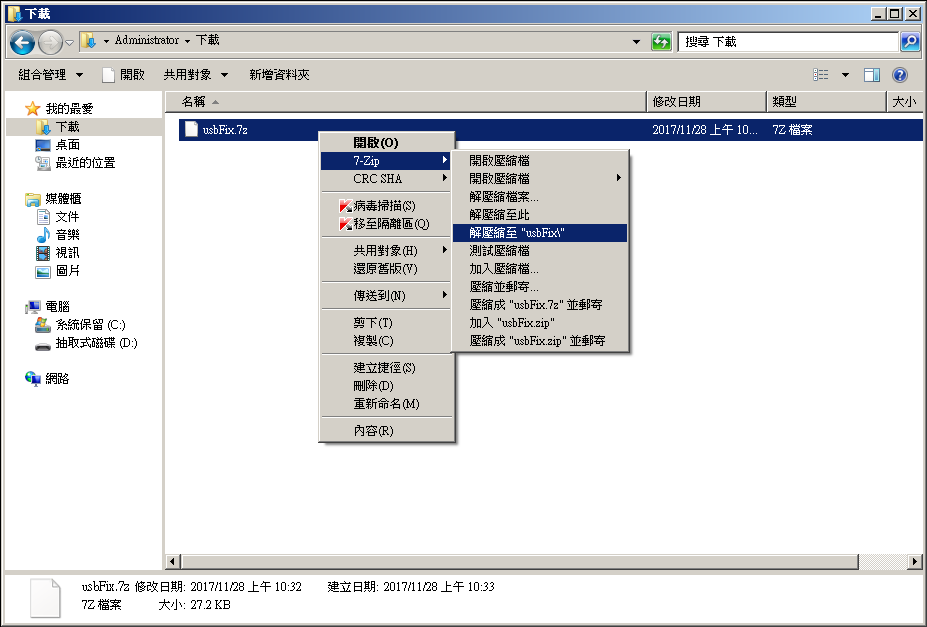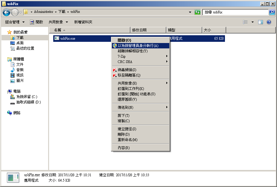 點進usbFix資料夾,將滑鼠指到 usbFix.exe 按滑鼠右鍵,以系統管理員身份執行(A) 。