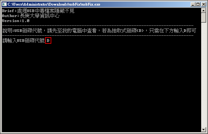 本案例隨身碟代碼為(D),故僅輸入D即可 。